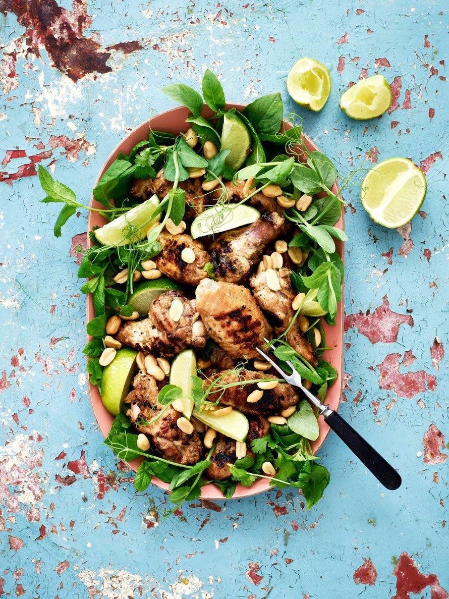 - Laita paahtuneet siiv t reilulle yrttipedille ja ripottele pinnalle pähkinöitä. Viipaloi oheen limettiä tarjolle.