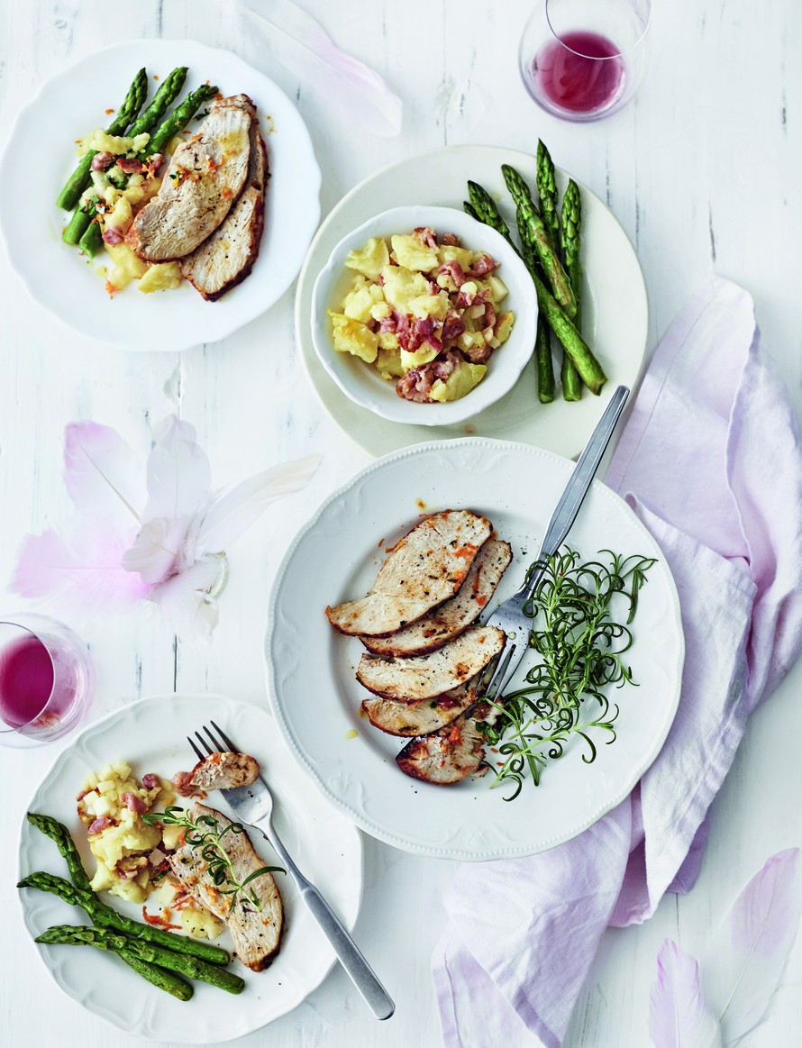 - Viipaloi rintafilee. Pyöräytä parsat lämpimiksi pannussa voin ja viipaloidun valkosipulin kanssa. Tarjoa provoloneperunoiden kera.