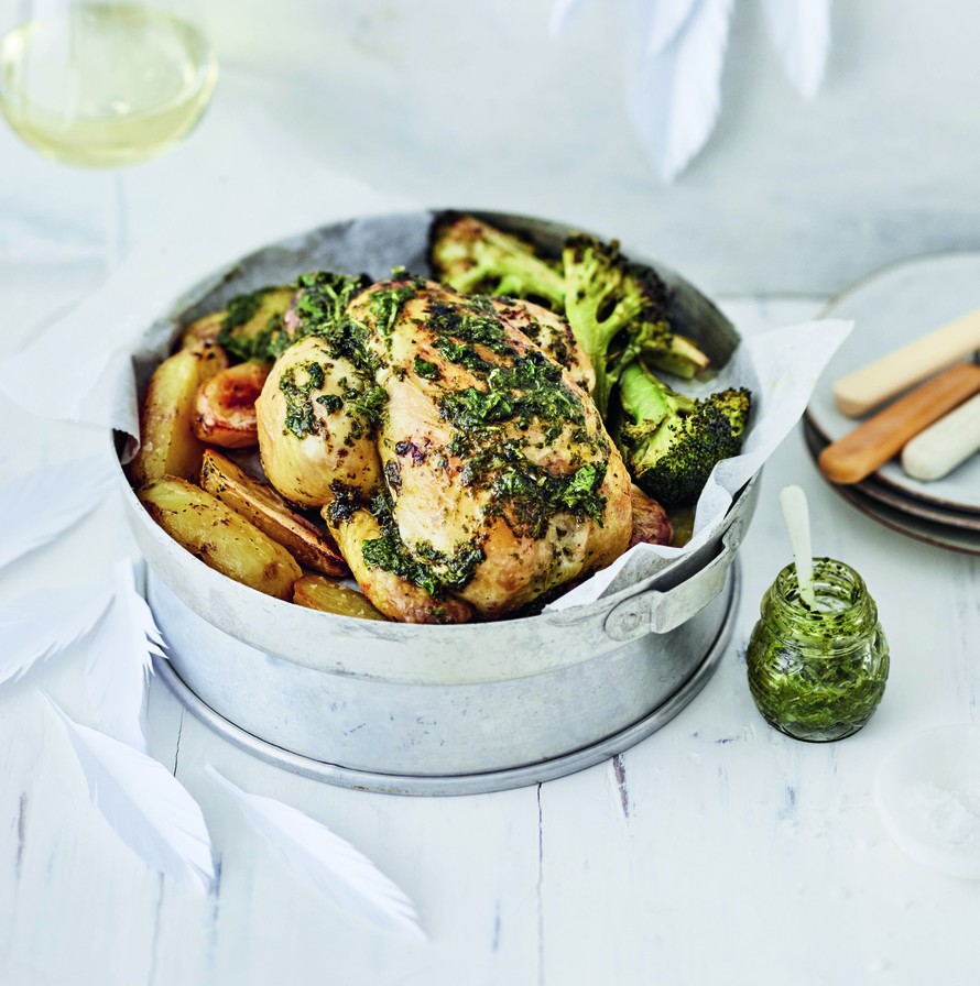 - Laita uuni kuumenemaan 225 asteeseen. Pyyhi kana talouspaperilla sisältä ja päältä. Leikkaa muutama viilto kanan nahkaan ja työnnä voita nahan alle. Hiero suola ja pippuri pintaan. Lisää voinokareita ja muutama lusikallinen chimichurria kanan päälle. Säästä loppu kastike tarjoiluun.