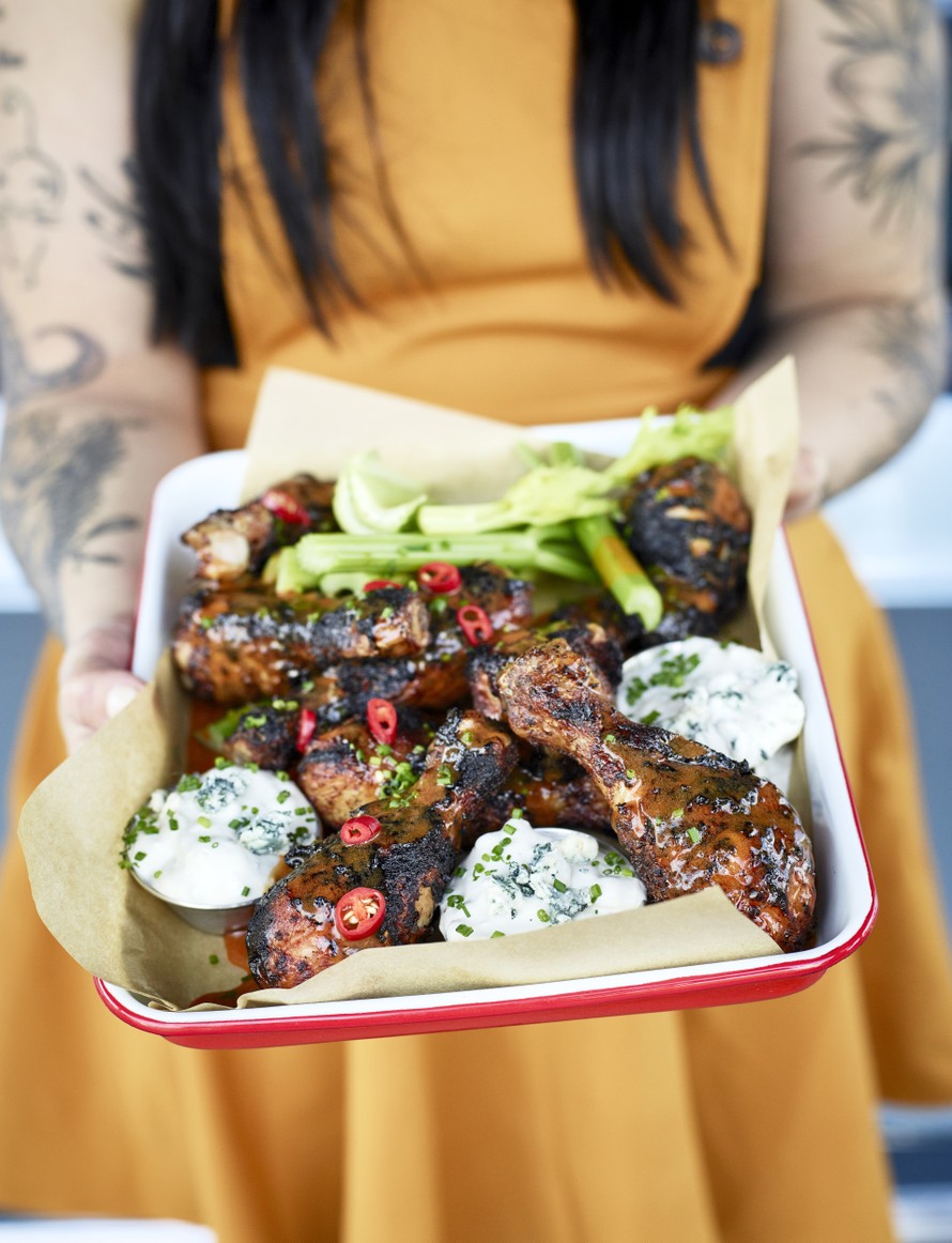 - Laita koivet vuokaan ja kaada kuuma buffalokastike päälle. Viimeistele ruohosipulilla ja tarjoa selleritikkujen ja sinihomejuustodipin kera.