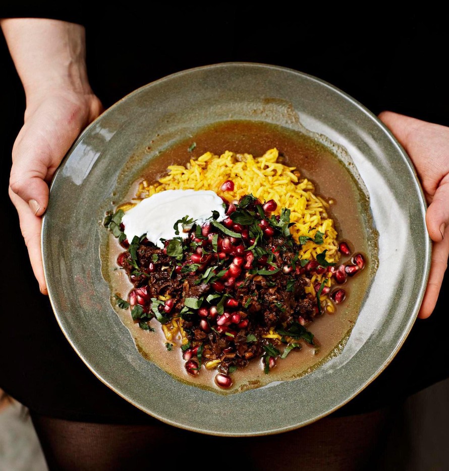Keltainen sahramiriisi, syvän tumma pata ja jalokivimäiset koristeeksi ripotellut granaattiomenan siemenet tekevät tästä juhlapöytään sopivan aterian.