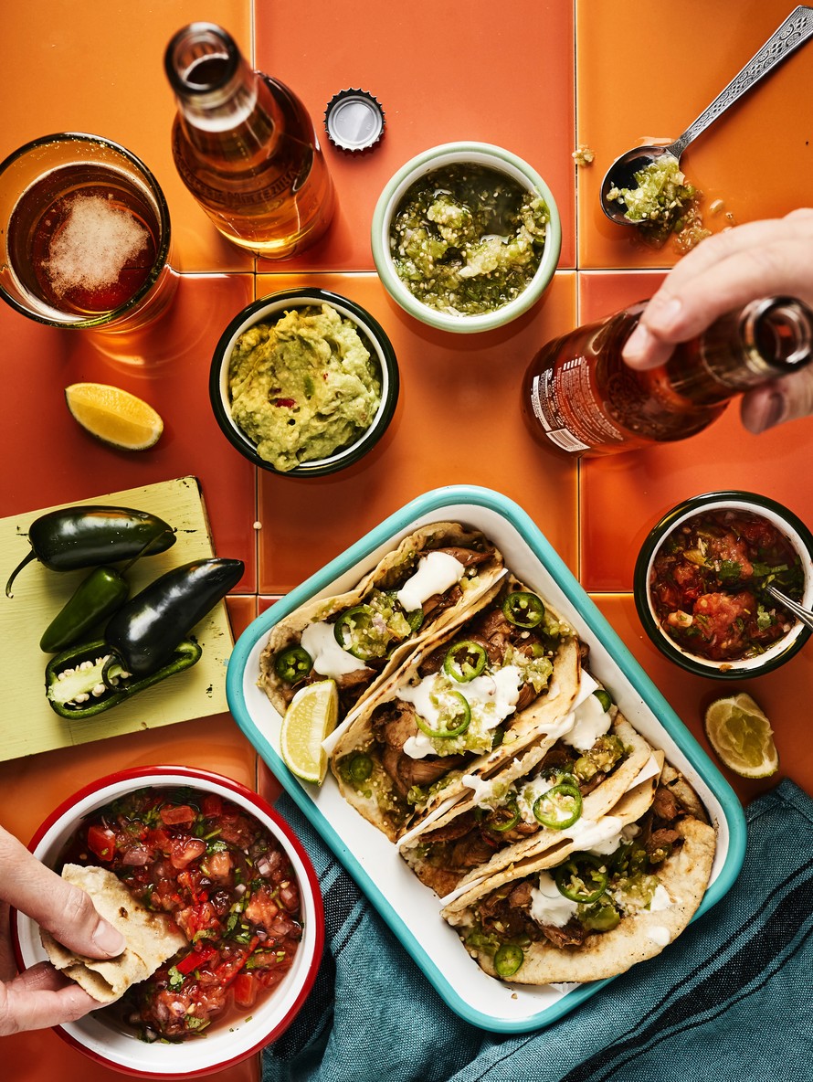 Täytteen kypsyessä ehtii valmistella muut lisukkeet, kuten meksikolaisen salsa verden ja limetticreman. Jopa tortillat voi halutessaan valmistaa itse, mutta yhtä hyvin voi käyttää kaupan valmiita pieniä maissitortilloja, jotka on helppo taittaa rennoiksi taskuiksi.