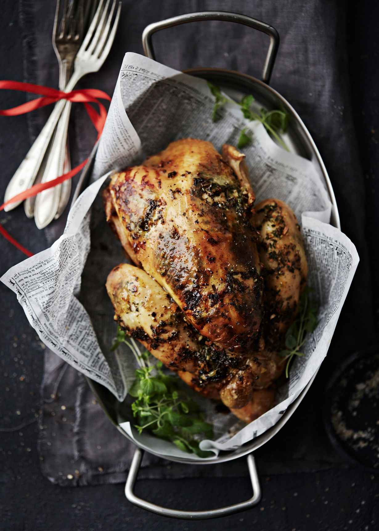 Kokonainen kana sopii mainiosti juhlapöytään. Valkosipulilla ja mandariinilla piristetty maustevoi pitää kanan mehevänä.