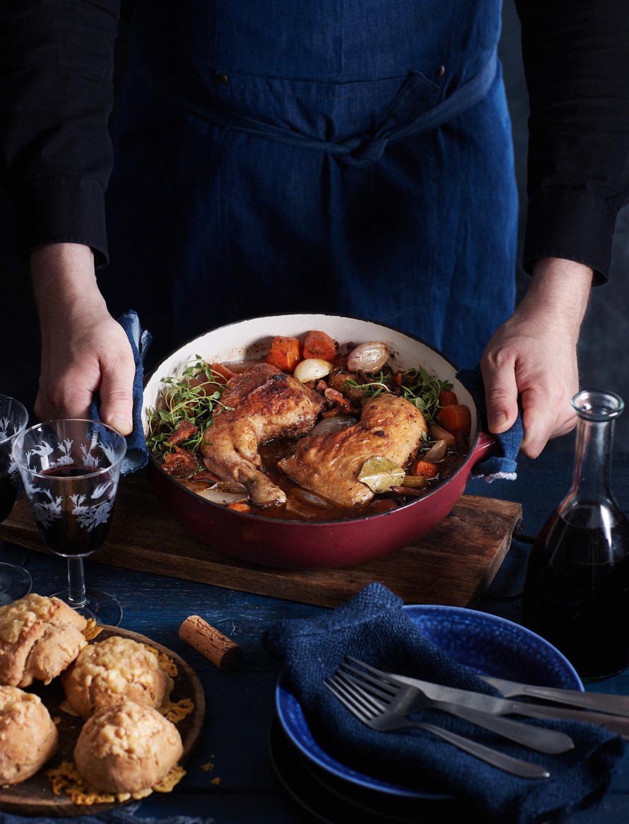 Ranskalainen klassikko kukkoa viinissä onnistuu hyvin edullisista broilerinkoivista.