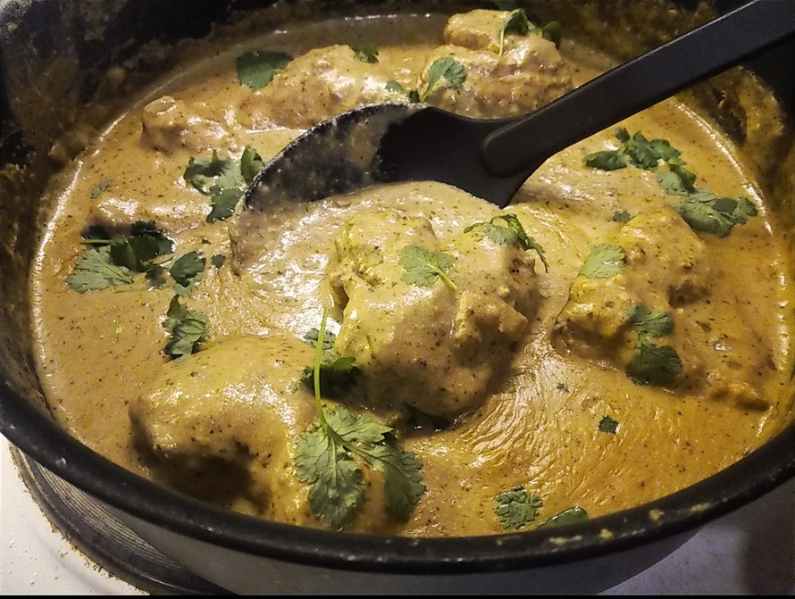 - Lisää broilerit pannulle. Anna kiehahtaa ja laske lämpötila alas. Anna hautua 30 min kunnes kastike on paksuuntunut.