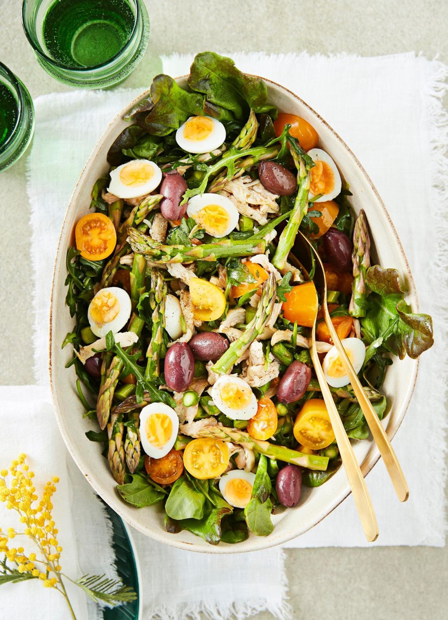 Vinkki! Salaatti valmistuu nopeammin, jos teet sen grillikoivista. Nyhdä kypsät broilerinkoivet ja kaada marinadi päälle. Viiriäisenmunat voi hyvin korvata kananmunilla.
