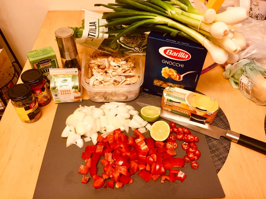 Lisää broileri ja pasta kattilaan. Kun keitto kiehahtaa lisää kerma, kookosmaito.