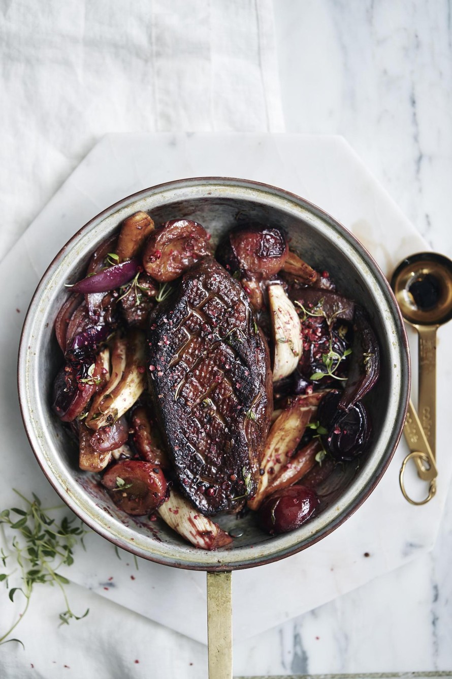 Täydellinen ohje ankanrintojen paistamiseen! Samalla pannulla hautuvat mehukkaat luumut ja fenkolit.