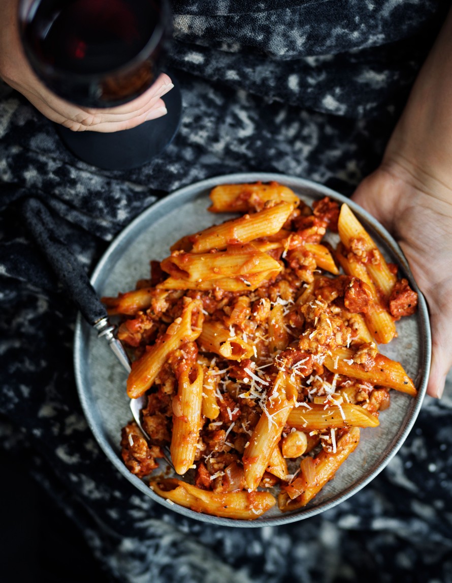 - Käännä lämpö kovemmalle. Lisää punaviini ja anna sen kiehahtaa. Lisää tomaattimurska, vesi, kuiva pasta ja mausteet. Sekoita.