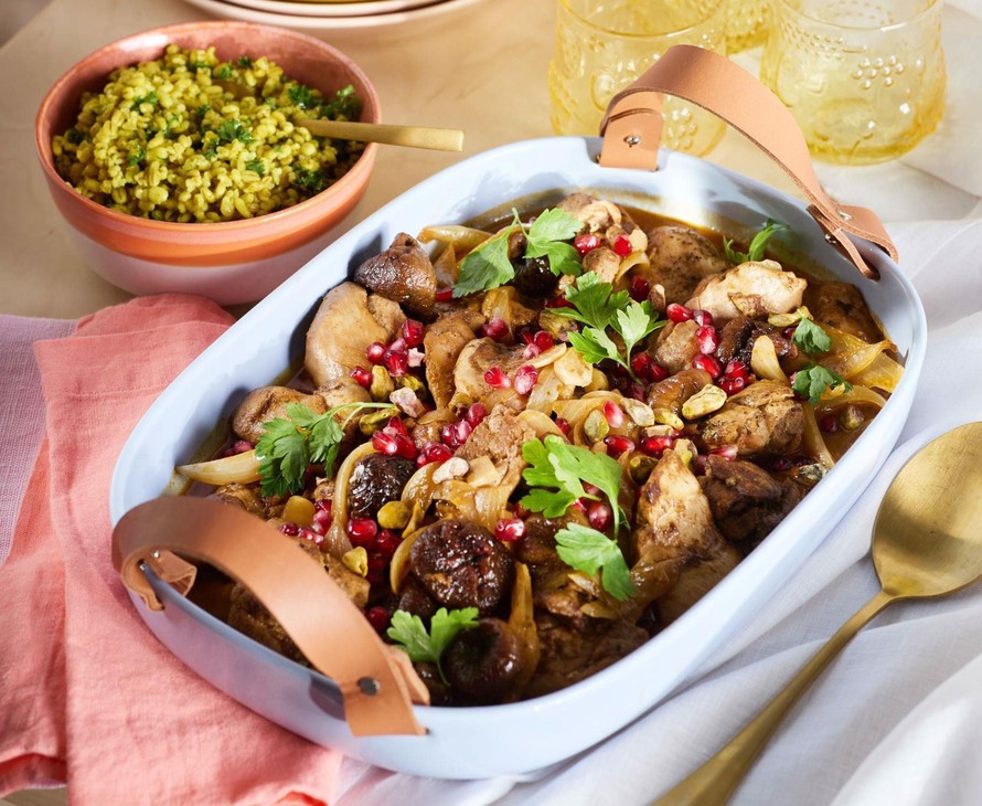 Makean mausteinen viikunakanapata tuo arkeen ripauksen Lähi-idän tunnelmaa: mehevä kana, pehmeät viikunat ja lämmin mausteisuus kypsyvät täyteläiseksi padaksi, jonka kruunaavat pistaasit, granaattiomena ja tuore persilja.