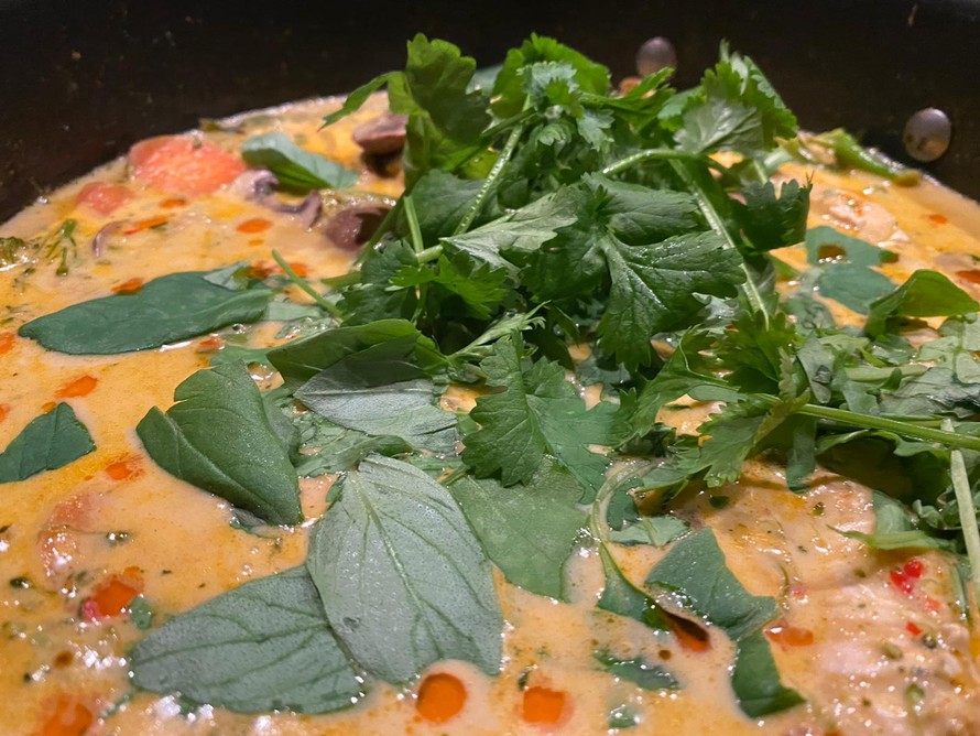 - Tarkista maku. Lisää lopuksi curryn pinnalle yrtit. Tarjoile kookosriisin kera.