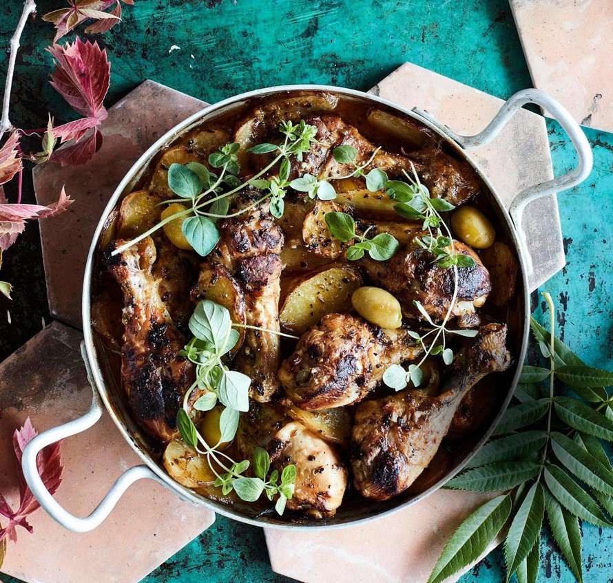 Kypsennä ensin kannen alla 45 minuuttia ja vielä noin 30 minuuttia ilman kantta. Lisää lopuksi vihreitä oliiveja halutessasi.