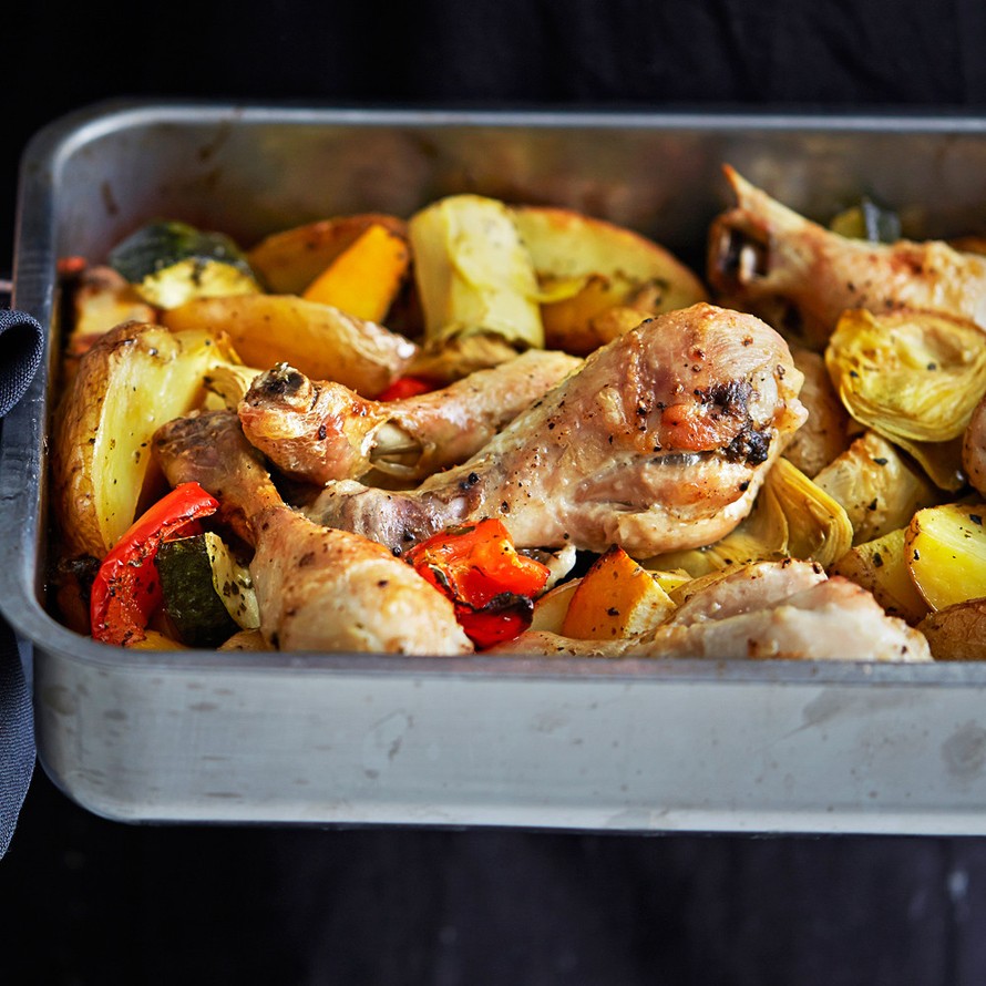 - Halkaise artisokat. Leikkaa kesäkurpitsa reiluiksi paloiksi. Paloittele paprika. Pese sitruuna ja leikkaa se lohkoiksi. Lisää artisokat, paprika, kesäkurpitsa, sitruuna ja kuorimattomat valkosipulinkynnet uunivuokaan. Mausta oreganolla, suolalla ja pippurilla. Paista 10 minuuttia. Varo, ettei pinta pala ja peitä tarvittaessa foliolla.