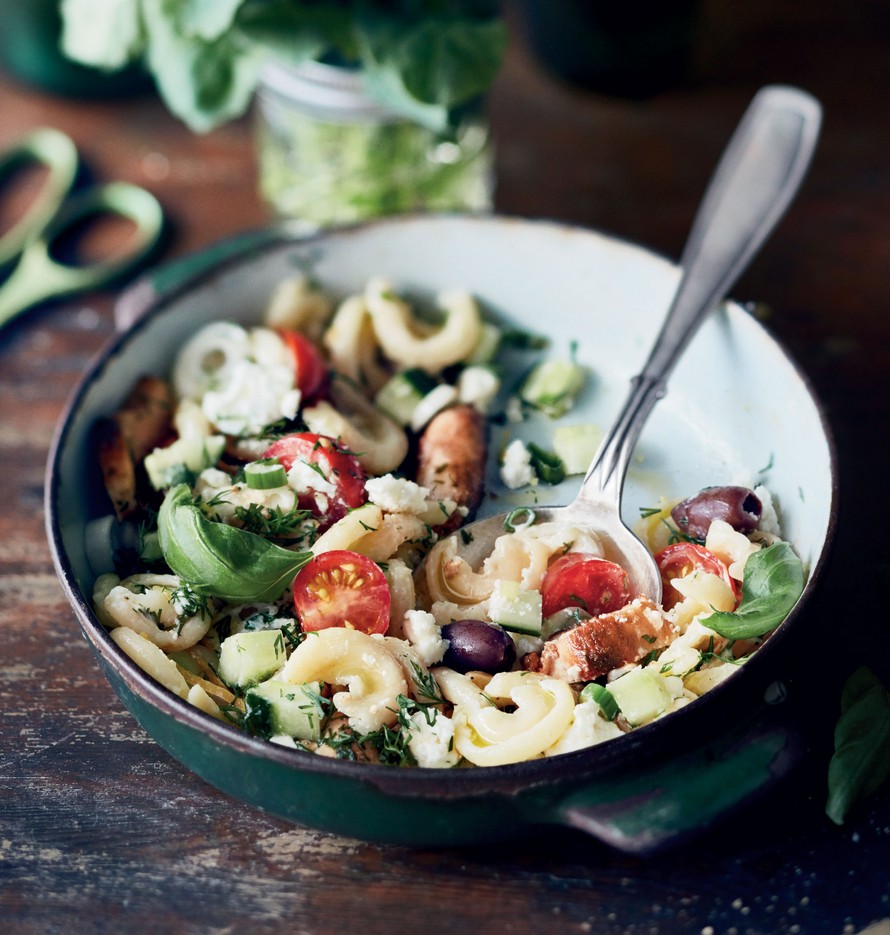 Kesäklassikko, kreikkalainen salaatti, lainaa raaka-aineensa parhaaseen kesäpastaan.
