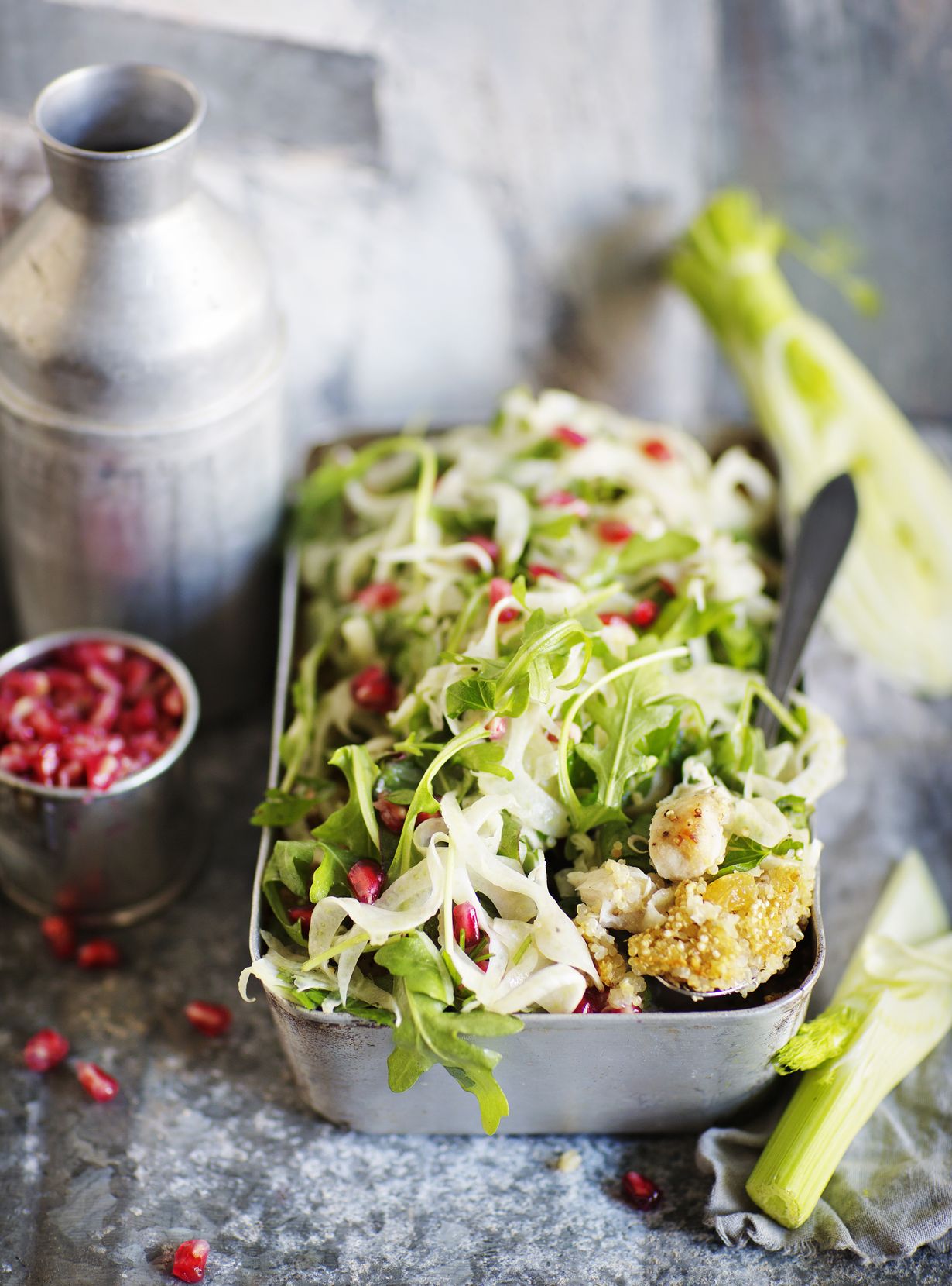 Ruokaisa kvinoabroileri raikastetaan salaatilla, jossa on fenkolia ja granaattiomenansiemeniä.