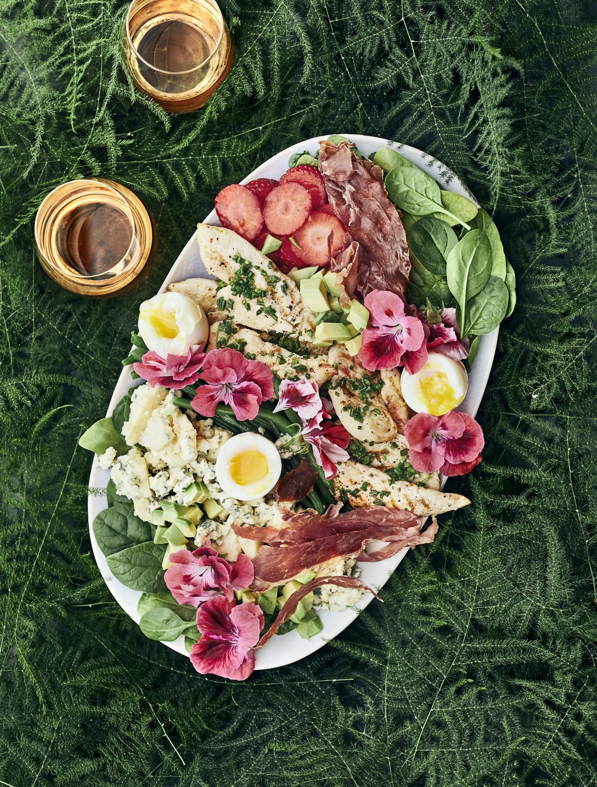Amerikkalainen cobb pursuaa juustoa, broileria ja kananmunaa. Kesäisen asunsa se saa mansikoista ja pinaatista.