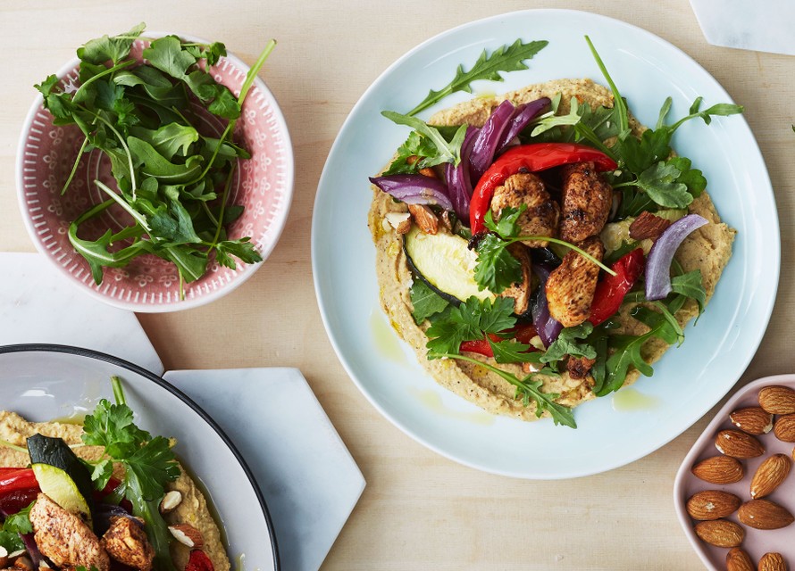 - Kokoa salaatti levittämällä hummusta lautasille ja kasaamalla päälle kasviksia, rucolaa, lehtipersiljan lehtiä, manteleita ja kanaa.