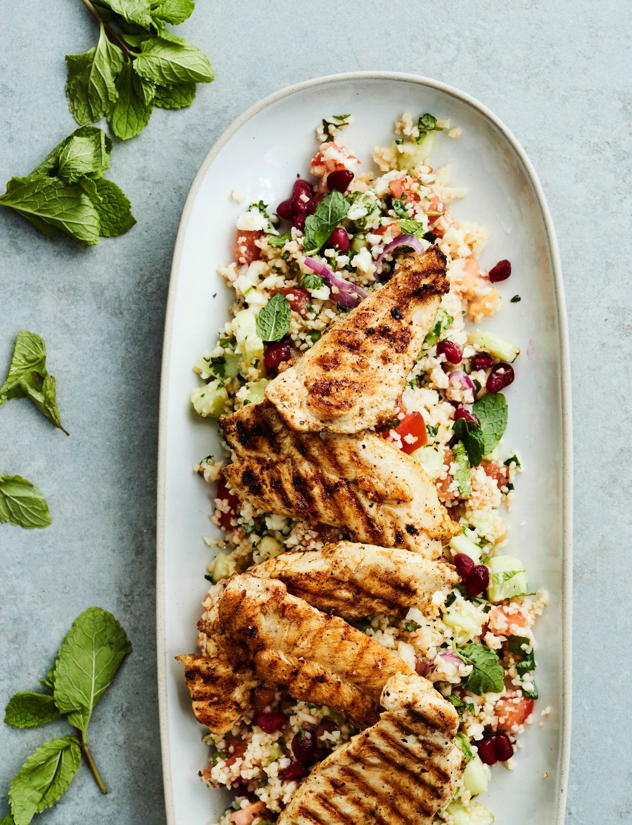Broilerinleikkeet saavat ihanasti makua kukkaisesta Ras el hanout -mausteseoksesta, joka on pohjoisafrikkalaisen keittiön yleismauste. Paistetut broilerit tarjoillaan sitruunaisella bulgursalaattipedillä.