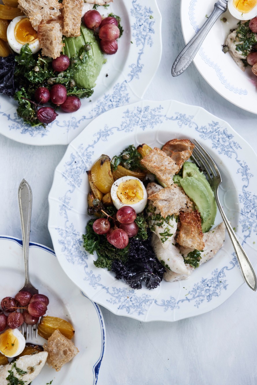 - Nosta juurekset, rypäleet, broileri, leipä ja lehtikaali tarjoilulautasille. Lisää keitetyt kananmunat ja viipaloidut avokadot.