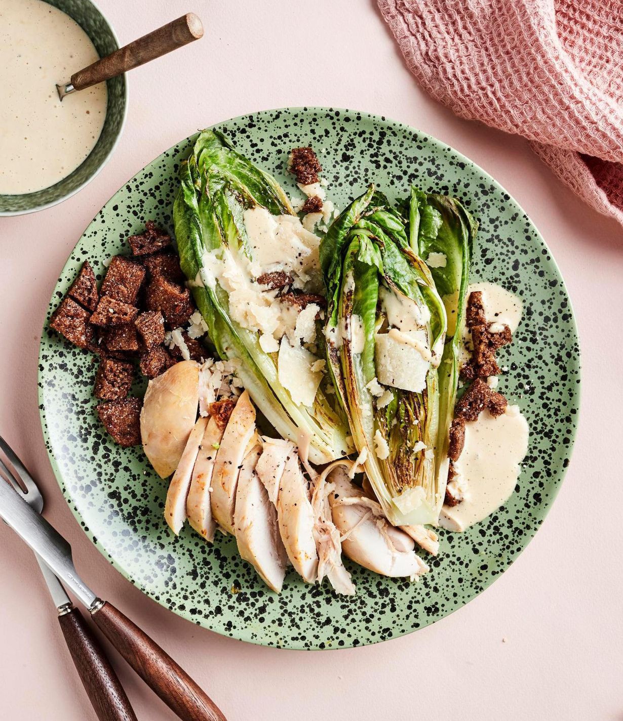 Revi tai leikkaa kypsä broileri suupaloiksi. Nosta salaatinpuolikkaat lautasille. Lisää broilerit. Valuta päälle kastiketta. Ripottele pinnalle parmesaanilastut ja krutongit.