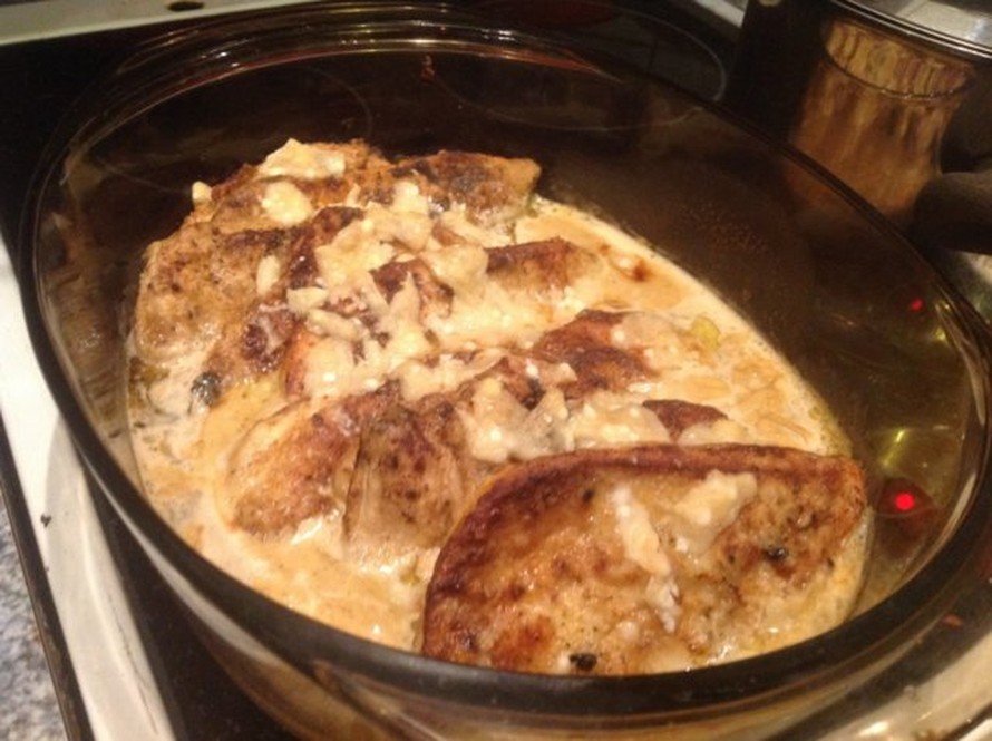 Laita lihat uunivuokaan. Lisää kanaliemi, vermutti, kerma ja marinadi liemi. Ripottele pinnalle parmesaanijuustoa.