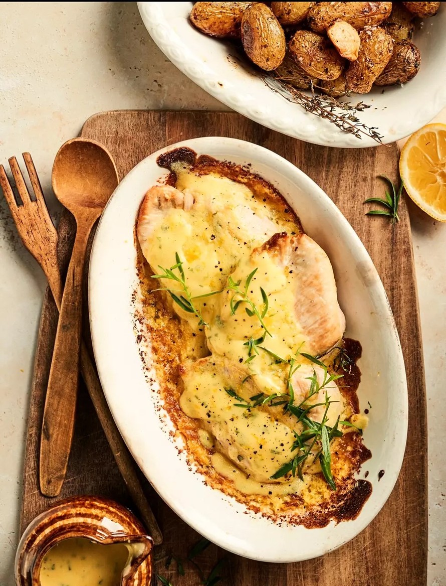 Tuoreella rakuunalla ja kirvelillä maustettu klassinen bearnaisekastike eli bearninkastike levitetään pikaisesti ruskistettujen broilerin fileepihvien päälle uunivuokaan, jolloin broileri kypsyy kastikkeen alla meheväksi.