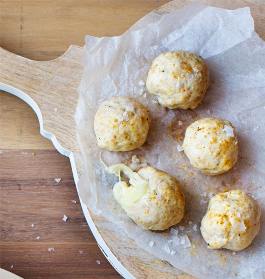 - Lisää korppujauhot ja sekoita tasaiseksi. Pyörittele taikinasta kookkaita pyöryköitä ja paina sisään pieni mozzarellapallo. Sulje pyöryköiden pinta huolella. Pane pyörykät leivinpaperin päälle uunipellille ja paista 225 asteessa noin 10 minuuttia, kunnes pyörykät ovat kypsiä. Tarjoa kuumina.