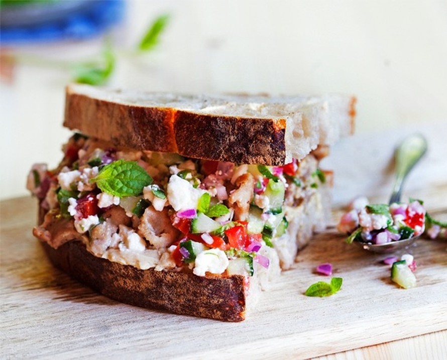Voitele leivät hummuksella, lisää broileria ja reilusti kasviksia. Helppo lounas on valmis.