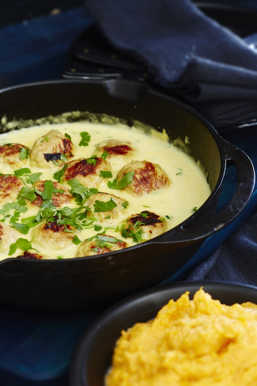Kun pullat ovat kypsiä, nosta kasari takaisin liedelle, lisää kastikkeeseen lehtipersilja ja kaada joukkoon broileripullat. Anna muhia 5 minuuttia hiljaisella lämmöllä kannen alla. Tarjoa bataattimuusin tai riisin kanssa.