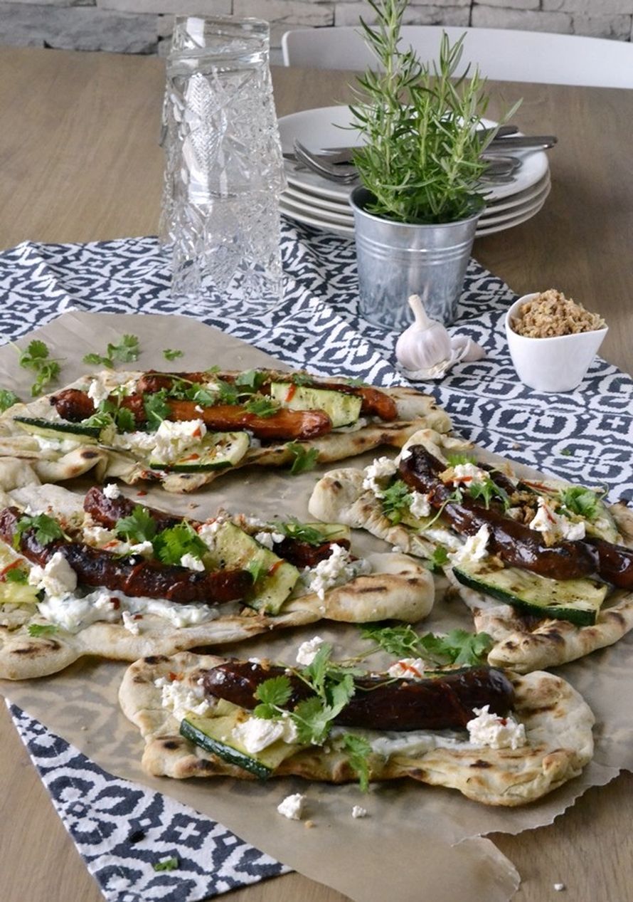 Voit paistaa kesäkurpitsat ja nakit myös pannulla tai 225-asteisessa uunissa. Kokoa flatbreadit. Levitä leipäpohjalle kesäkurpitsatsatsikia. Asettele päälle grillatut kesäkurpitsat ja broilerinakit. Murustele päälle fetajuusto ja mausta viirulla sriracha-kastiketta. Ripottele päälle vielä paahdettua sipulia sekä tuoretta korianteria.