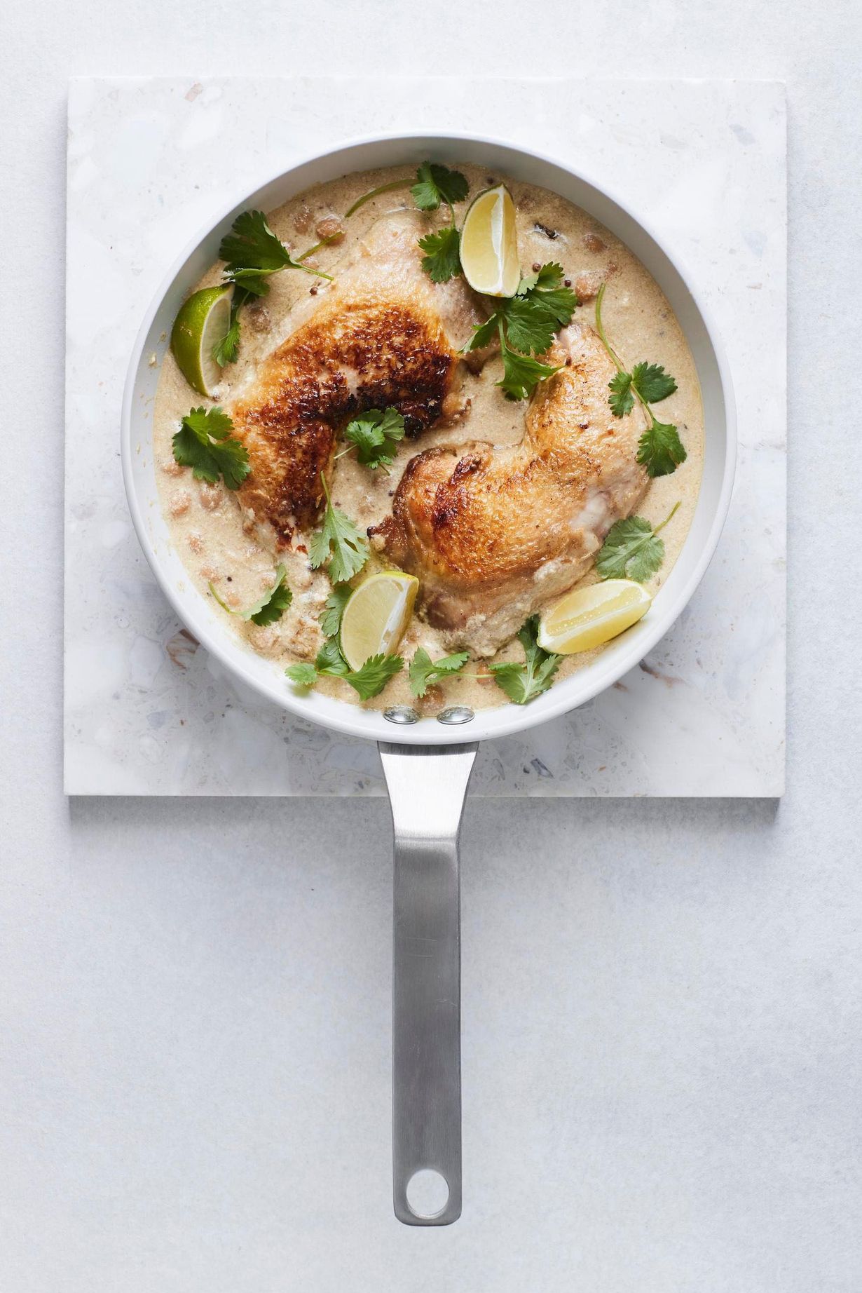 5. Ota pannu uunista ja nosta koivet pois kastikkeesta. Laita pannu liedelle. Sekoita pienessä kipossa 2 dl jugurttia ja maissitärkkelys suurukseksi. Sekoita se kastikkeeseen, kiehauta ja lisää joukkoon valutetut kikherneet ja koipireidet.