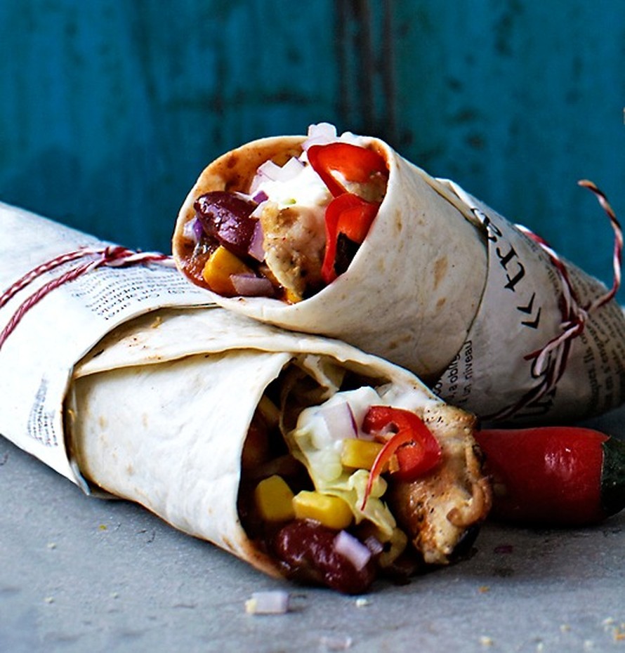 - Levitä mikrossa nopeasti lämmitetyille tortilloille kuumia broileriviipaleita, papusalsaa, maissia, avokadoviipaleita, silputtua punasipulia, ranskankermaa, rapeaa salaattia ja juustoraastetta. Kääri napakalle rullalle ja nauti heti.