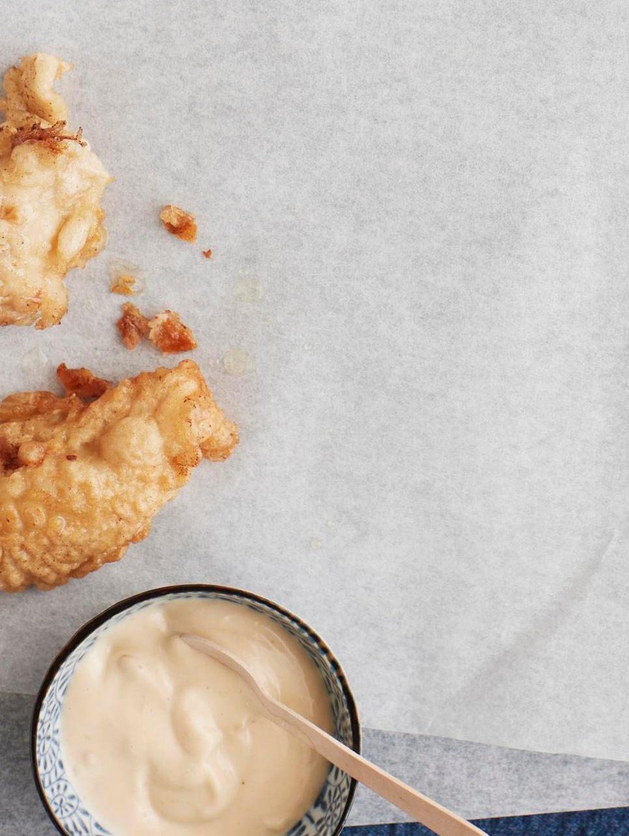 - Kieräytä kanapalat vehnäjauhoissa ja tempurataikinassa. Kypsennä paloja öljyssä noin 5 minuuttia, kunnes pinta saa väriä. Tee kypsennys useammassa erässä. Nosta palat ritilälle valumaan.