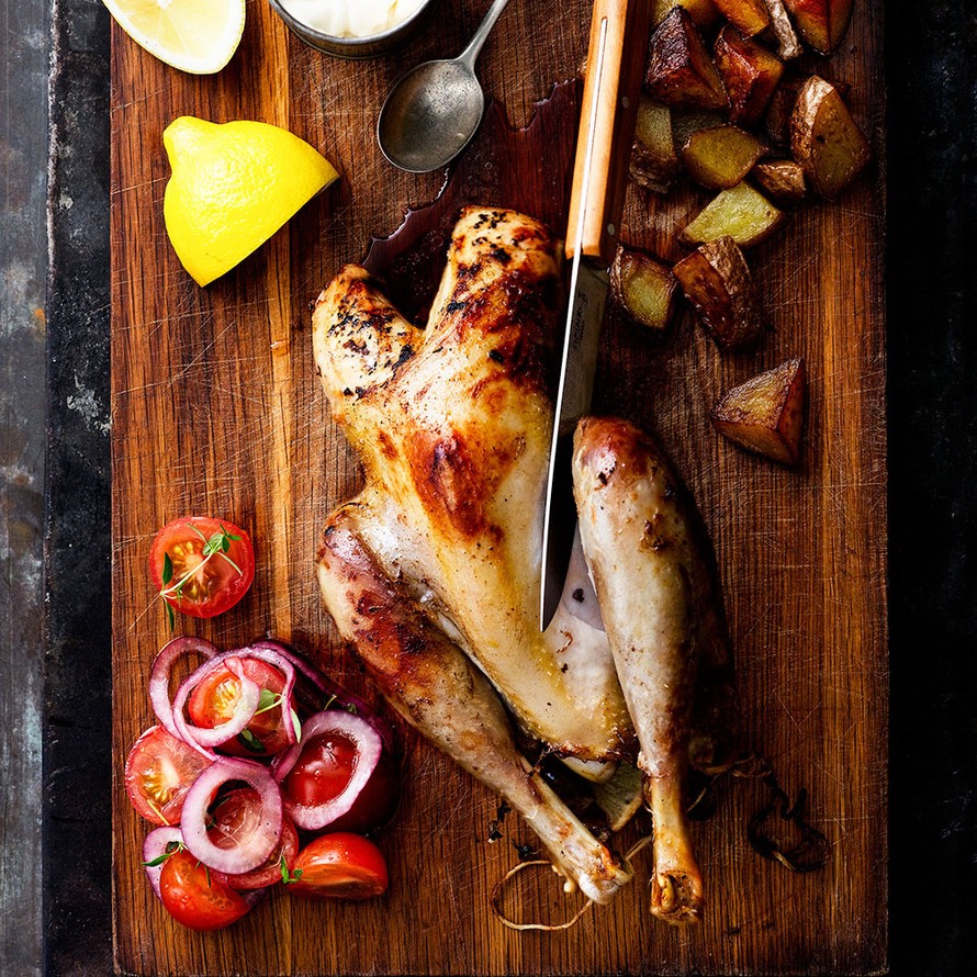 Kypsä broileri menee hetken levon jälkeen uudelleen uuniin. Tulos: rapea nahka.