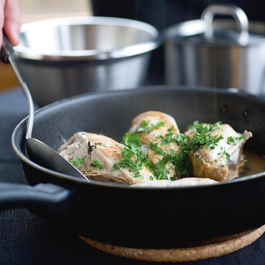 - Kasaa broilerinpalat tarjoilulautaselle. Lusikoi päälle pannulle jäänyt liemi ja tarjoile heti silputun persiljan kera.