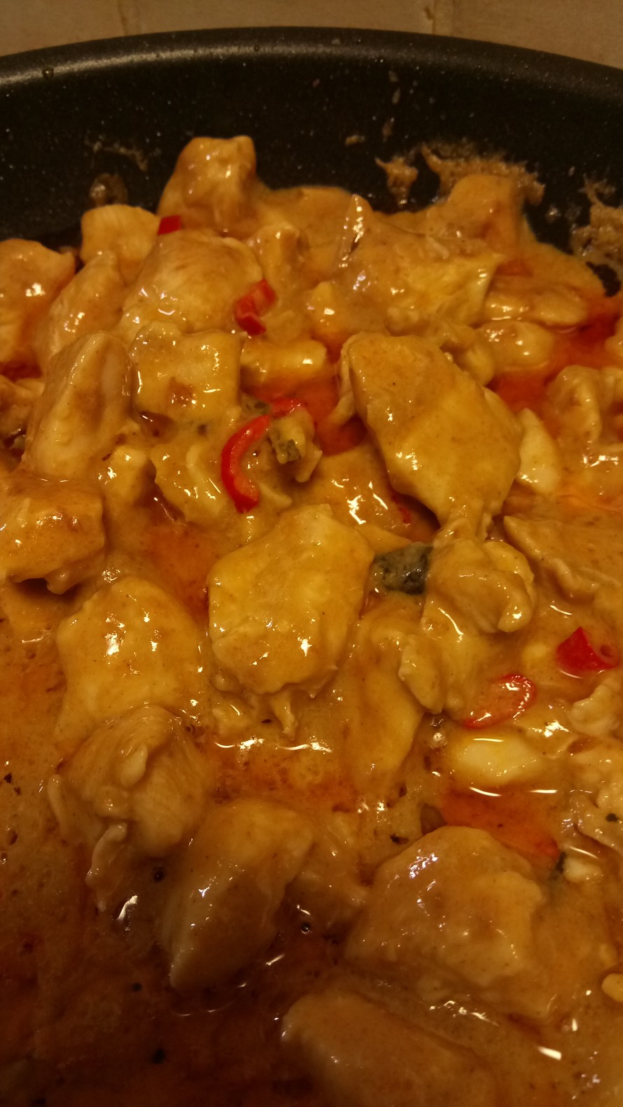Sekoita ja keittele miedolla lämmöllä, kunnes kastike paksuntuu ja määrä pienenee. Tässä vaiheessa rasva nousee pintaan. Koristele annos chilillä ja nautiskele jasmiiniriisin kanssa.