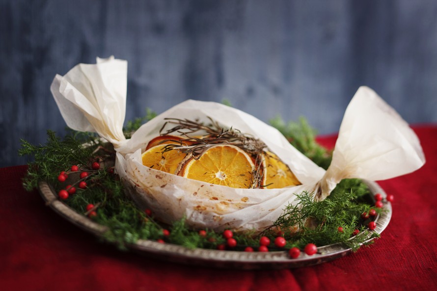 Aseta lantut SAGA Leivinarkin päälle. Nosta kalkkunanrinta lanttujen päälle. Lisää kalkkunan päälle viipaloidut appelsiinit sekä timjamin ja rosmariinin oksat. Kääri paperi sitten tiukaksi ja mahdollisimman tiiviiksi paketiksi.