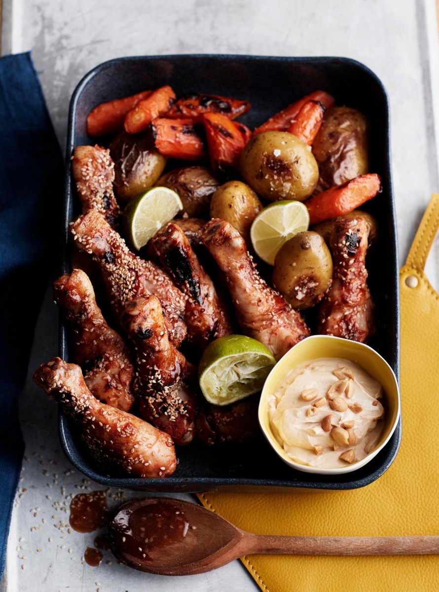 Perunat ja porkkanat kypsyvät seesami-broilerin kanssa kätevästi samassa vuoassa. Pähkinäistä kastiketta tekee mieli kauhaista iso lusikallinen.