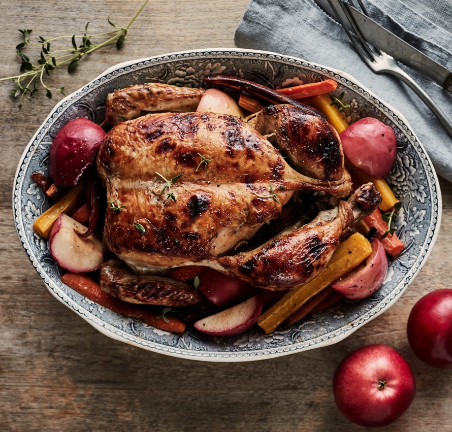 Yllätä sunnuntaipöydässä siideriglaseeratulla broilerilla. Ahkera valelu pitää huolen broilerin mehevyydestä. Samassa vuoassa kypsyvät lisukkeeksi sopivat omenat ja porkkanat.