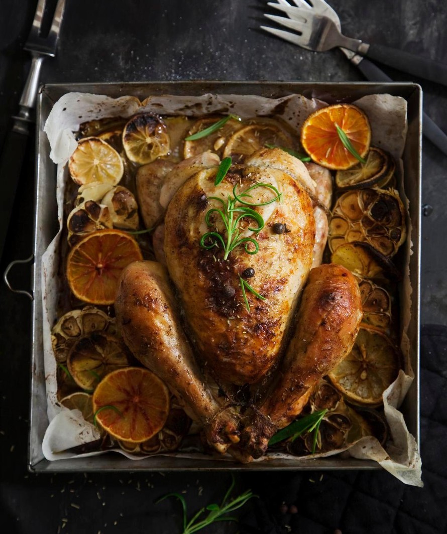 Kokonainen uunibroileri on täällä taas, entistä mehevämpänä! Salaisuutena on yrttivoi, jota sivellään kanan nahan alle. Sitrukset ja valkosipulit paahtuvat samassa vuoassa.