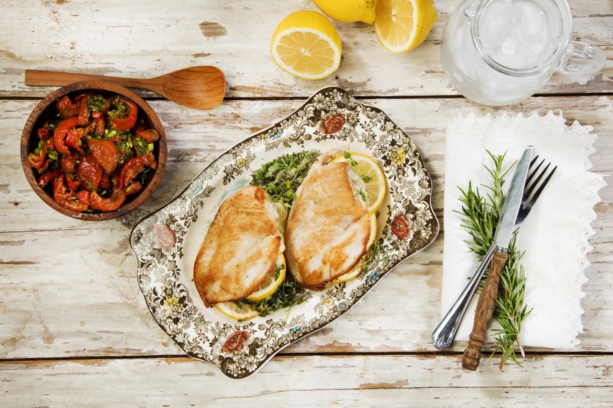 Ota perhosfileet huoneenlämpöön noin puoli tuntia ennen kokkausta. Pese sitruuna leikkaa se viipaleiksi. Kuivaa perhosfileet talouspaperilla ja mausta ne sisältä suolalla ja pippurilla. Täytä fileetaskut sitruunaviipaleilla.