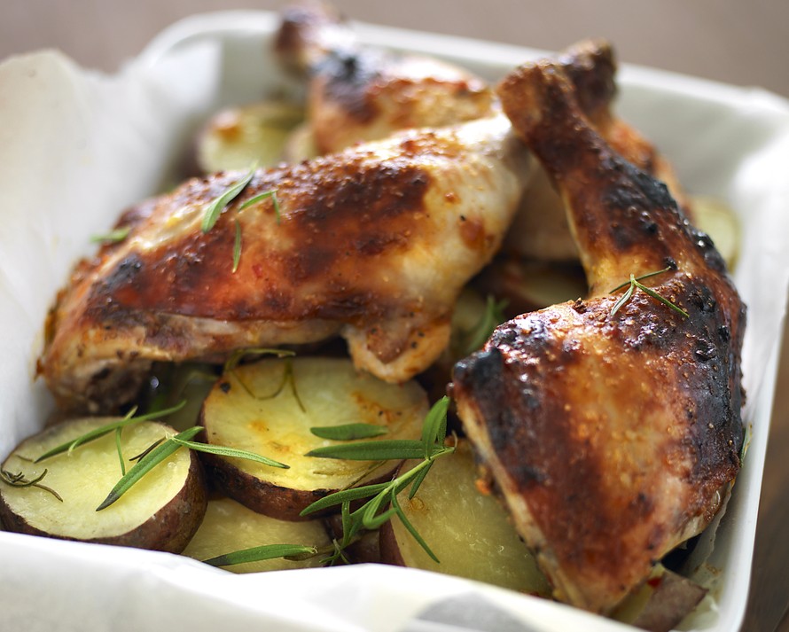 - Sekoita kaikki broilerinkoipien mausteainekset keskenään ja hiero seos koipien pintaan. Nosta koivet uunivuokaan perunoiden päälle ja paista 200-asteisessa uunissa 45–50 minuuttia. Jos koivet tummuvat pinnasta mielestäsi liikaa ja paistoaikaa on vielä jäljellä, peitä vuoka foliolla ja jatka paistamista. Tarjoile koivet ja perunaviipaleet raikkaan salaatin kera.