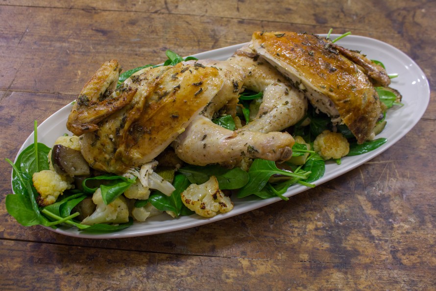 - Kun kana on kypsää leikkaa se puoliksi. Sekoita babypinaatti kasvisten sekaan ja tarjoa.