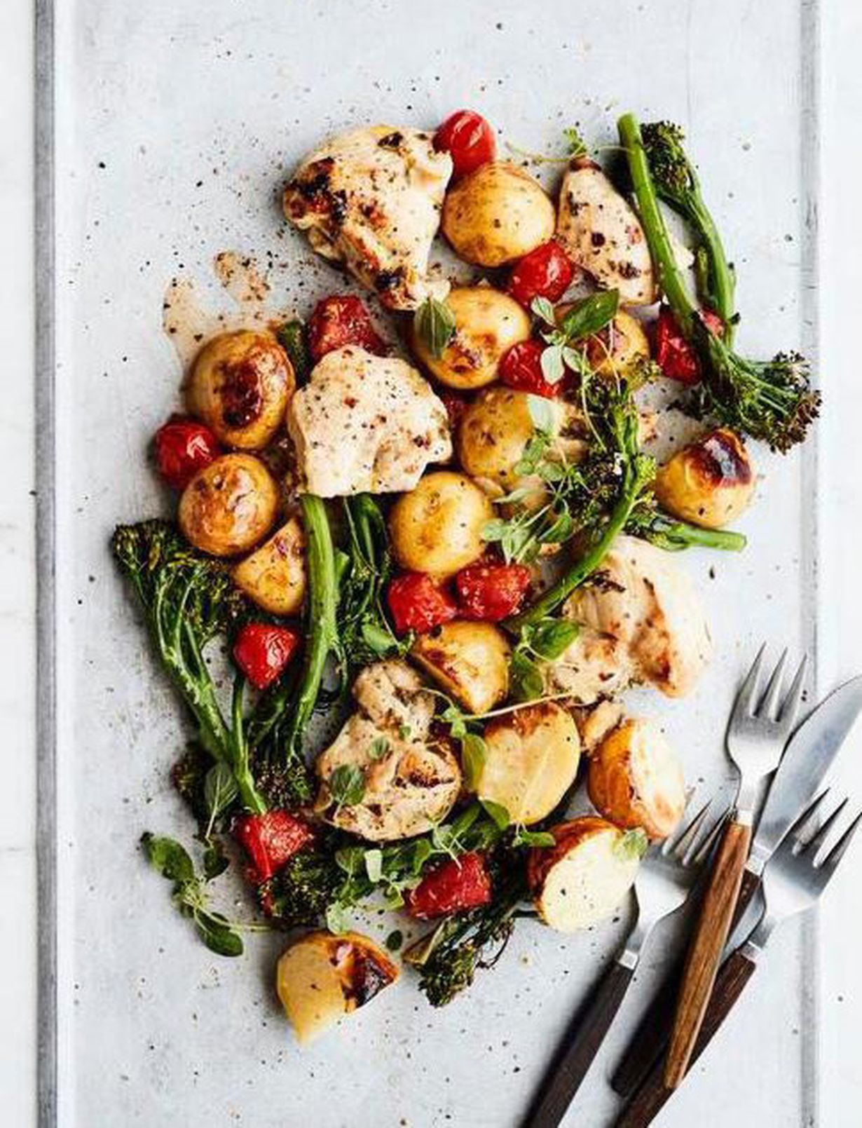 Sekoita marinadin ainekset. Lisää joukkoon broilerit ja perunat. Nosta perunat marinadista ja levitä ne leivinpaperin päälle pellille. Kypsennä 225-asteisessa uunissa 20 minuuttia. Lisää uunipellille perunoiden joukkoon broilerit, broccolinit ja kirsikkatomaatit. Jatka kypsentämistä vielä noin 10 minuuttia, kunnes perunat tuntuvat kypsiltä.