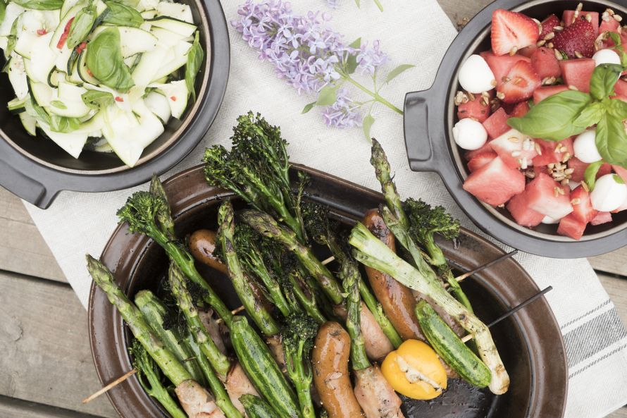 Työnnä vartaisiin vuorotellen broilerinakkeja, pekoniin käärittyjä parsoja, broccolineja, kevätsipuleita, juustolla täytettyjä paprikoita ja minikesäkurpitsoita. Grillaa vartaita sopivan miedolla lämmöllä molemmin puolin kunnes kasvikset, nakit ja pekonit ovat kypsyneet ja ottaneet itseensä mukavan kauniin paahteisen värin. Valele vartaita grillauksen lomassa grillauskastikkeella useampaan kertaan. Voit paistaa vartaat myös 180-asteisessa uunissa.