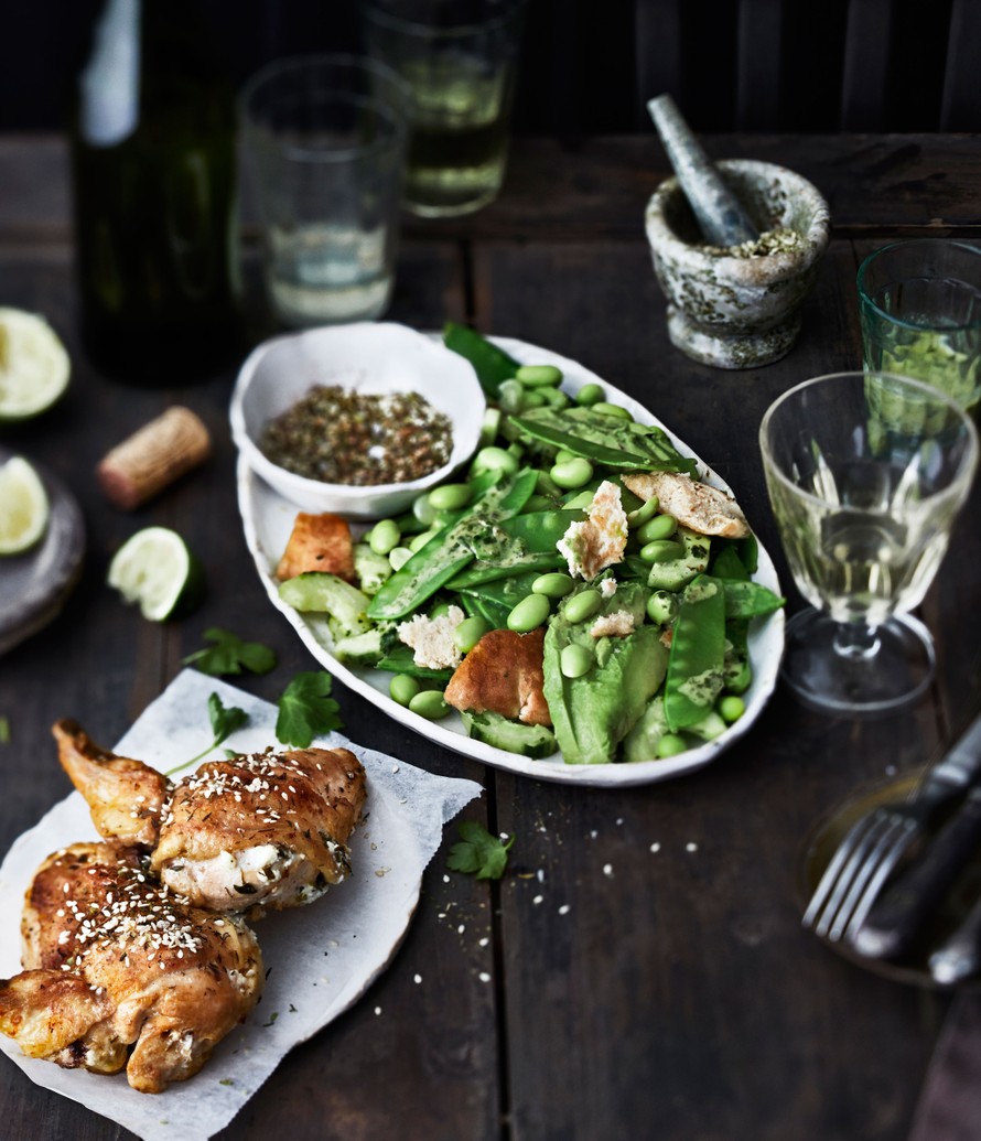 Maku on pääosassa, kun kananleikkeet täytetään fetalla ja maustetaan zaatarilla. Kaveriksi tehdään raikas salaatti edamame-pavuista ja herneenpaloista.