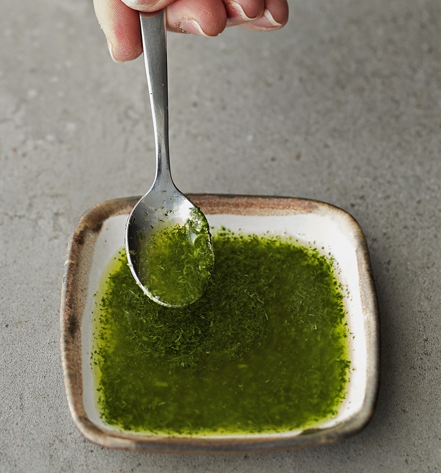 - Hienonna tilli tehosekoittimeen. Lisää öljy ja soseuta, kunnes öljy lämpenee hieman ja tillin lehtivihreä sekoittuu siihen. Halutessasi valuta öljy vielä harson läpi.
