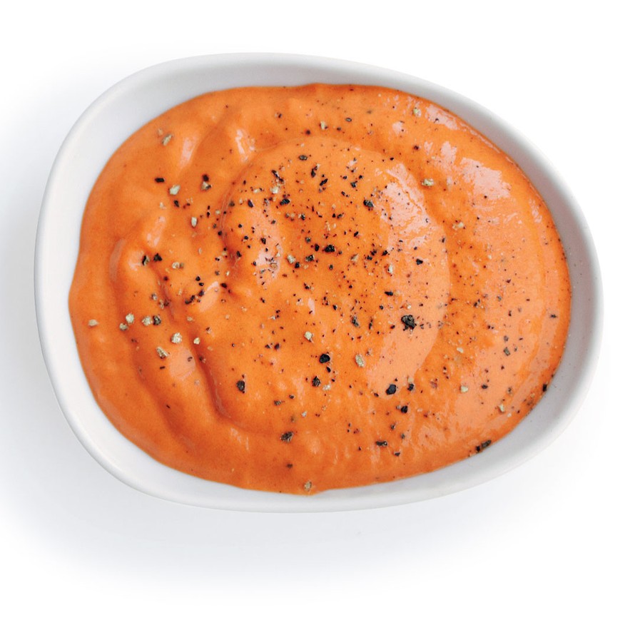 - Ota paprikat pussista, poista niistä siemenkota ja kuori sormin. Laita paprikoiden liha, majoneesi ja tabasco tehosekoittimeen ja aja tasaiseksi. Mausta suolalla.