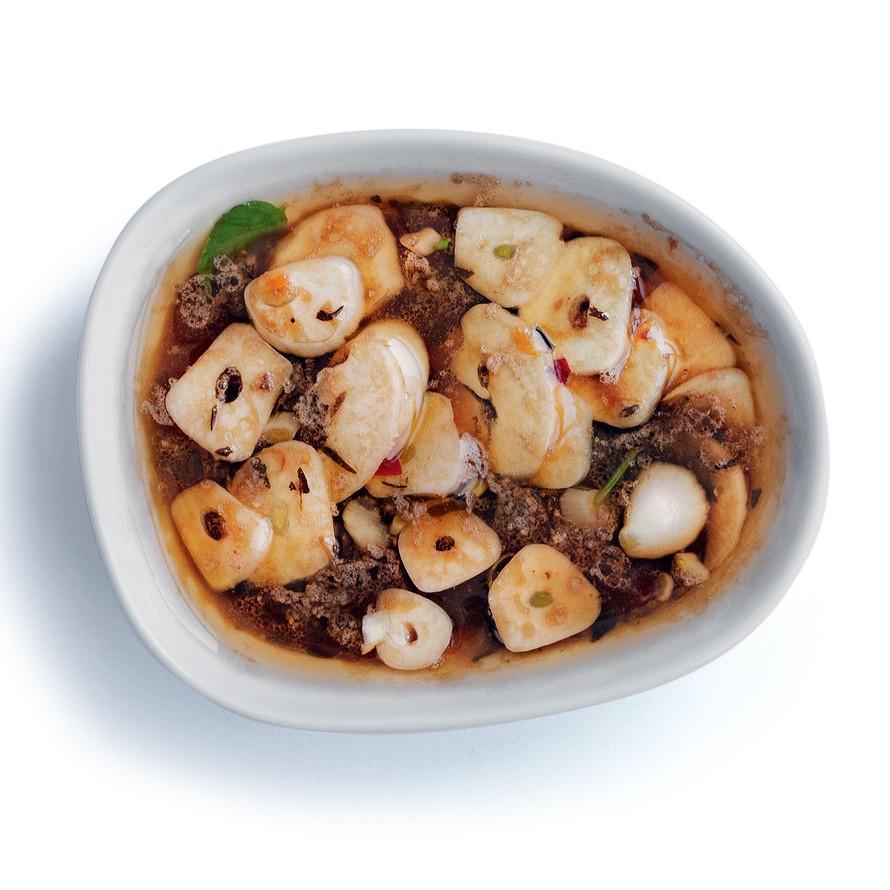 - Kuori ja viipaloi valkosipulit. Mittaa seesami- ja rypsiöljy kasariin ja kuumenna. Lisää valkosipulit ja anna niiden kiehua öljyssä vain noin 15 sekuntia. Lisää etikka ja savusuola. Sekoita ja jäähdytä.