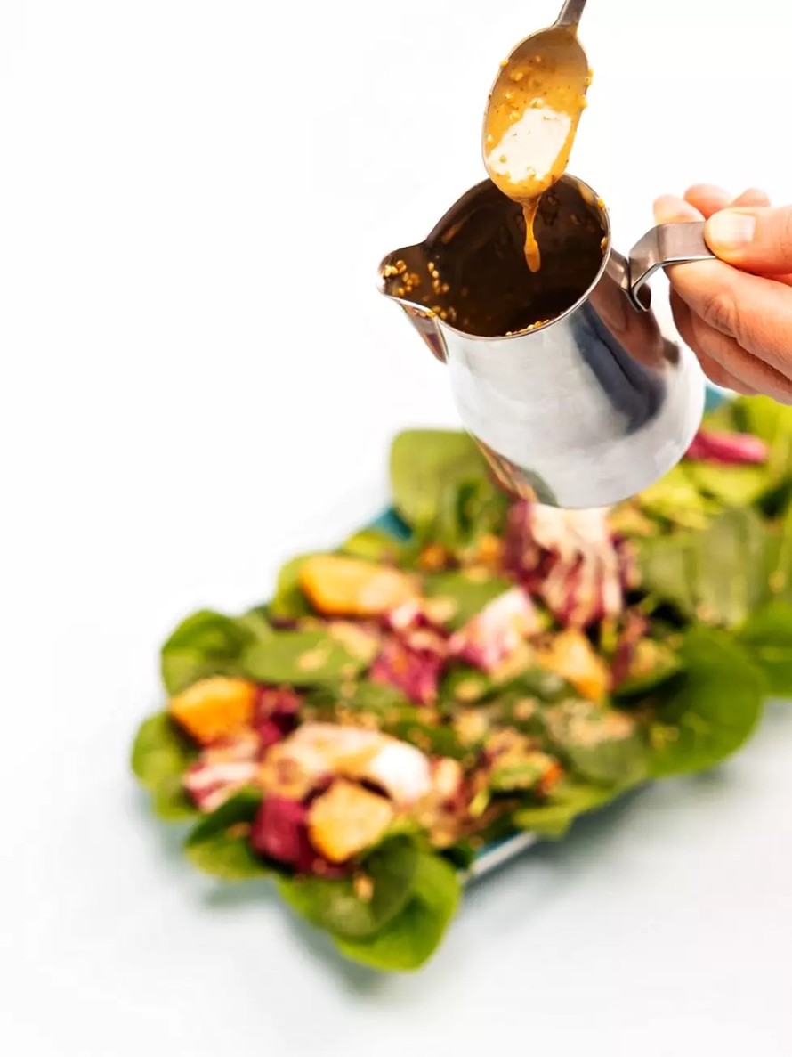 Kastikkeelle tekee hyvää maustua yön yli jääkaapissa, mutta sitä voi lisätä salaattiin myös heti. Säilytä jääkaapissa.